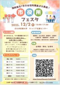 同窓会の協力のもと、福岡県内7市の市役所職員から仕事内容・やりがい・採用試験のポイントなどの情報を紹介いただきます。対象は、全学部・学科/全学年で、福岡県外の市職員を目指す方もご参加ください。